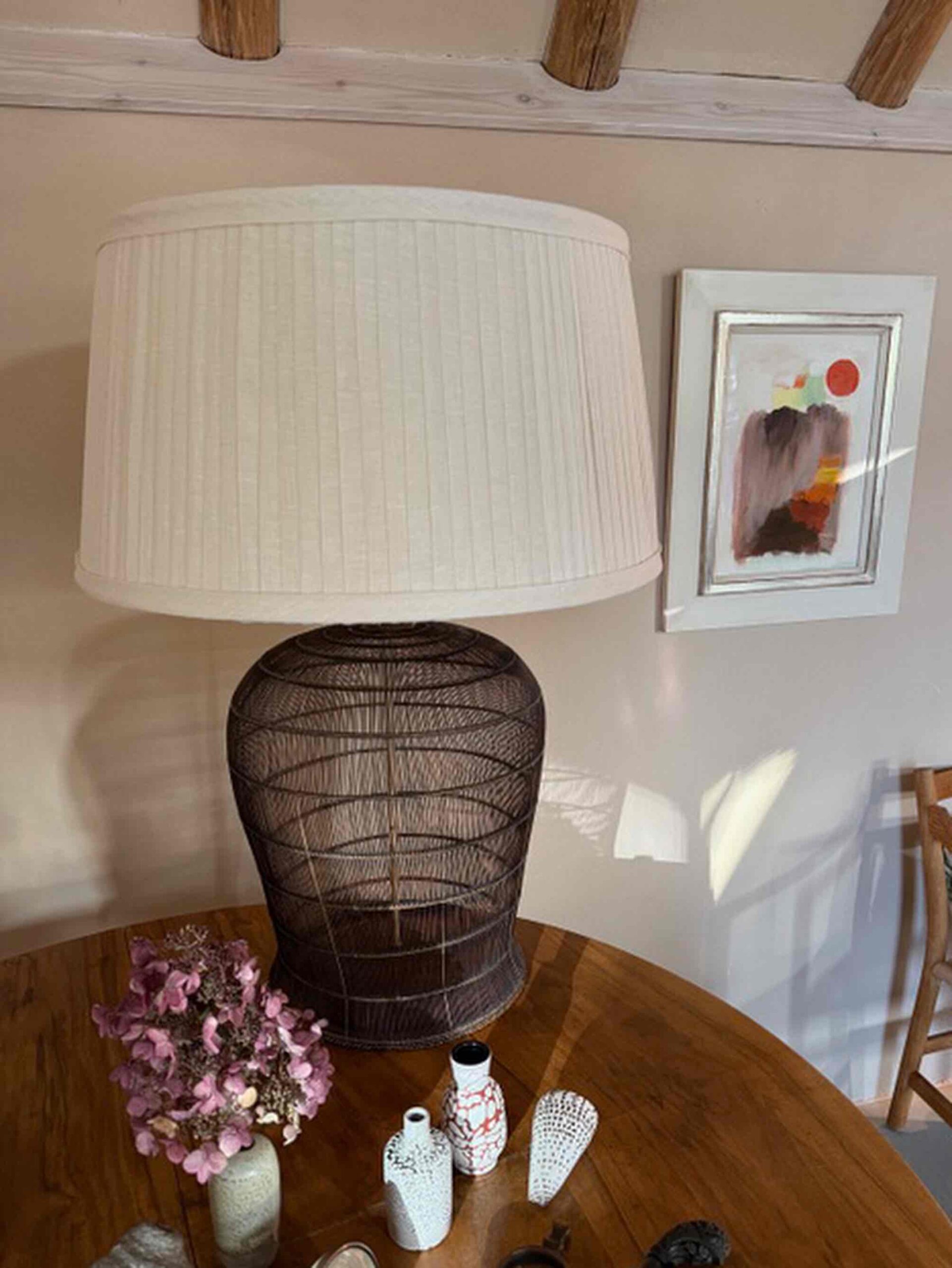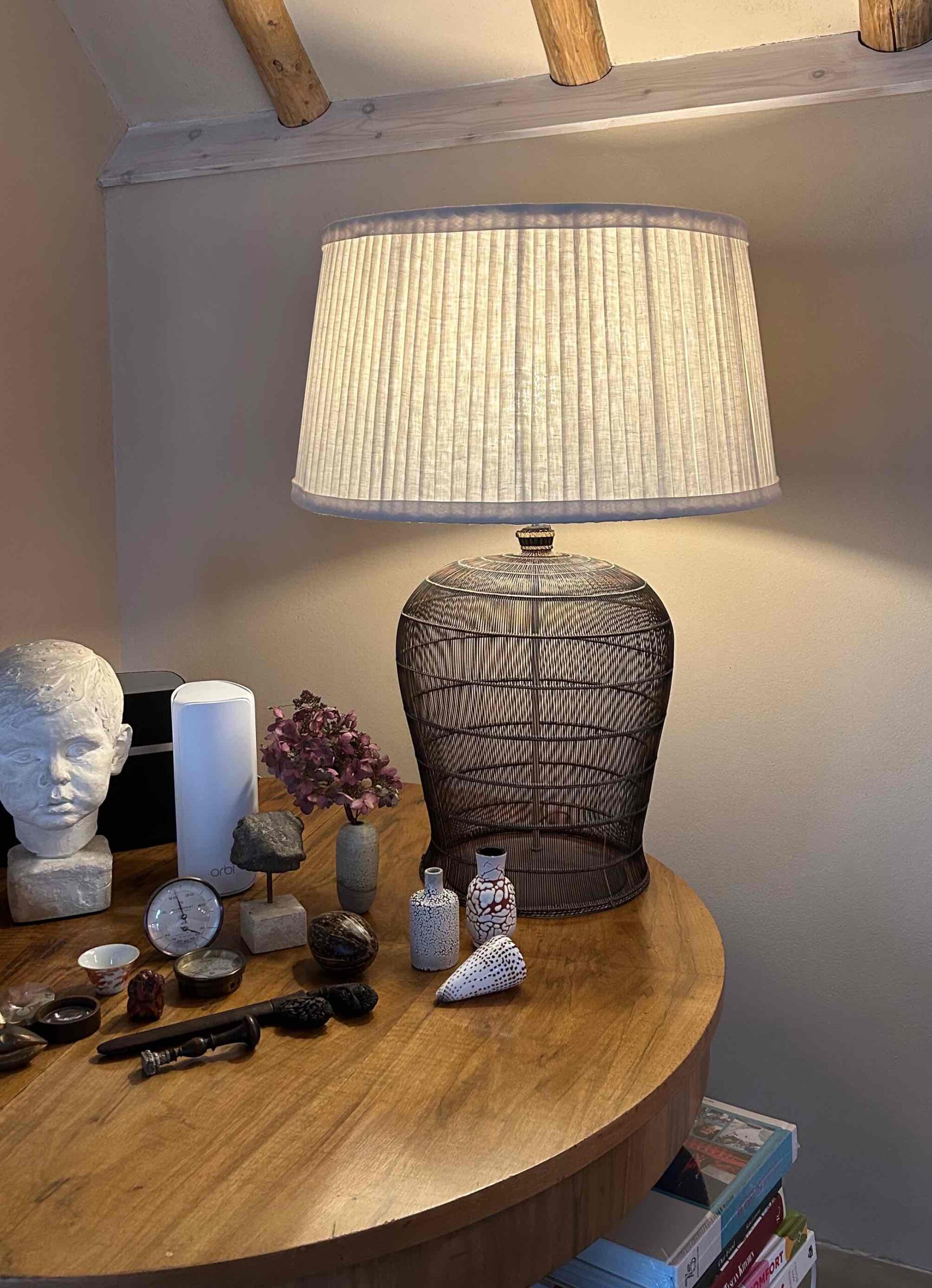 Hand-genaaide, geplooide lampenkap van zeer soepel vallende, natuurlijke linnen. In opdracht gemaakt. Klant wilde een zeer specifieke maat, dus heb ik een frame op maat laten lassen. Bijna al mijn frames laat ik op maat lassen om zo alle maten te kunnen leveren, passend bij jouw lamp, in jouw interieur. Dus absoluut geen groothandel of productiewerk.
