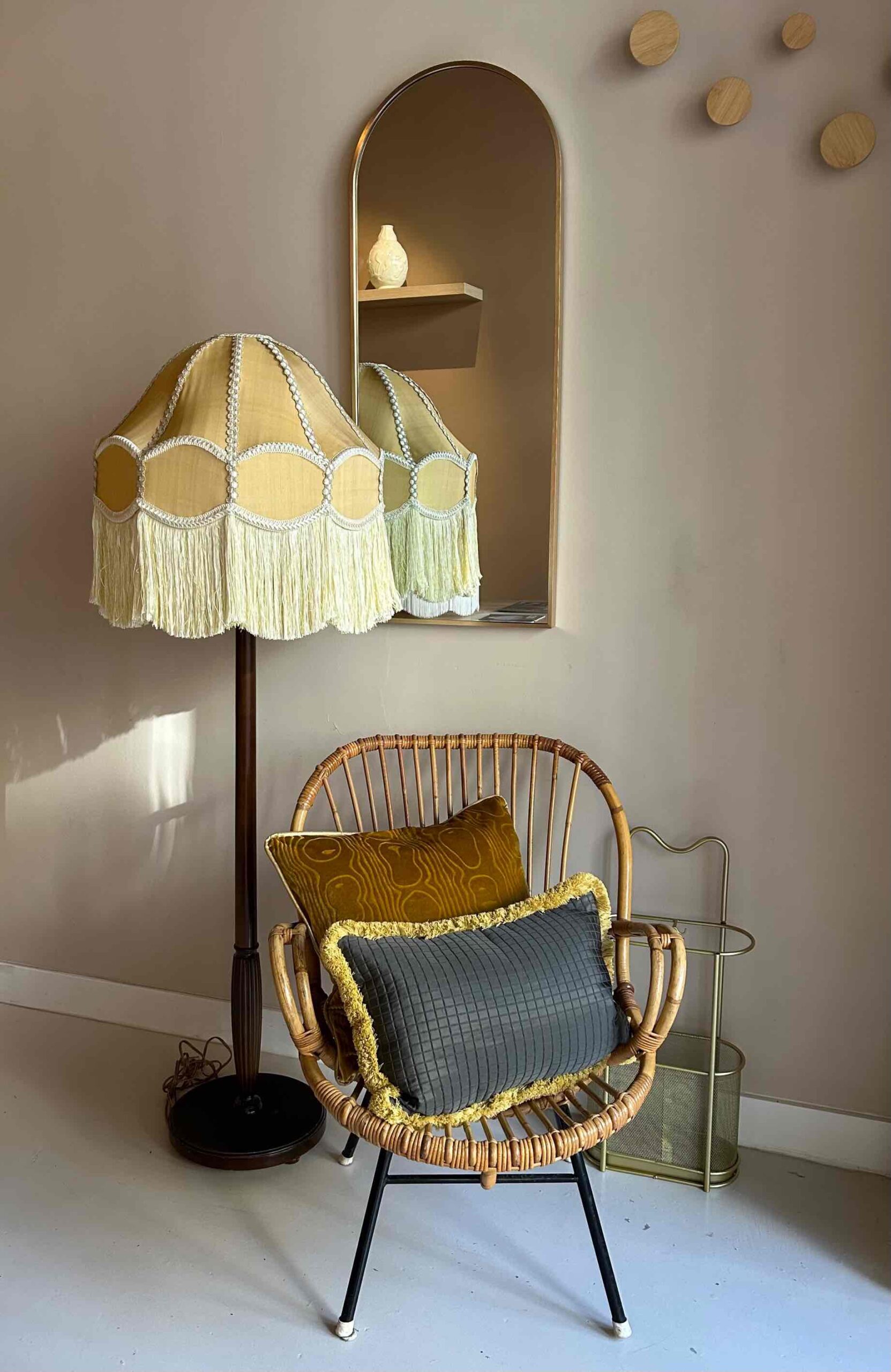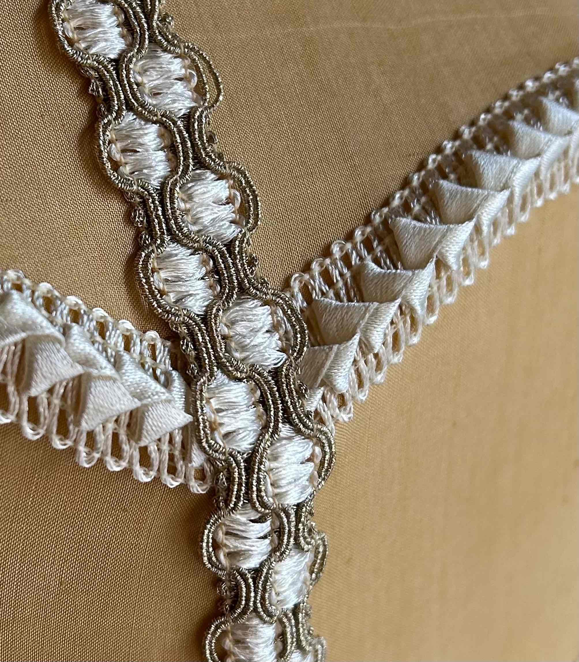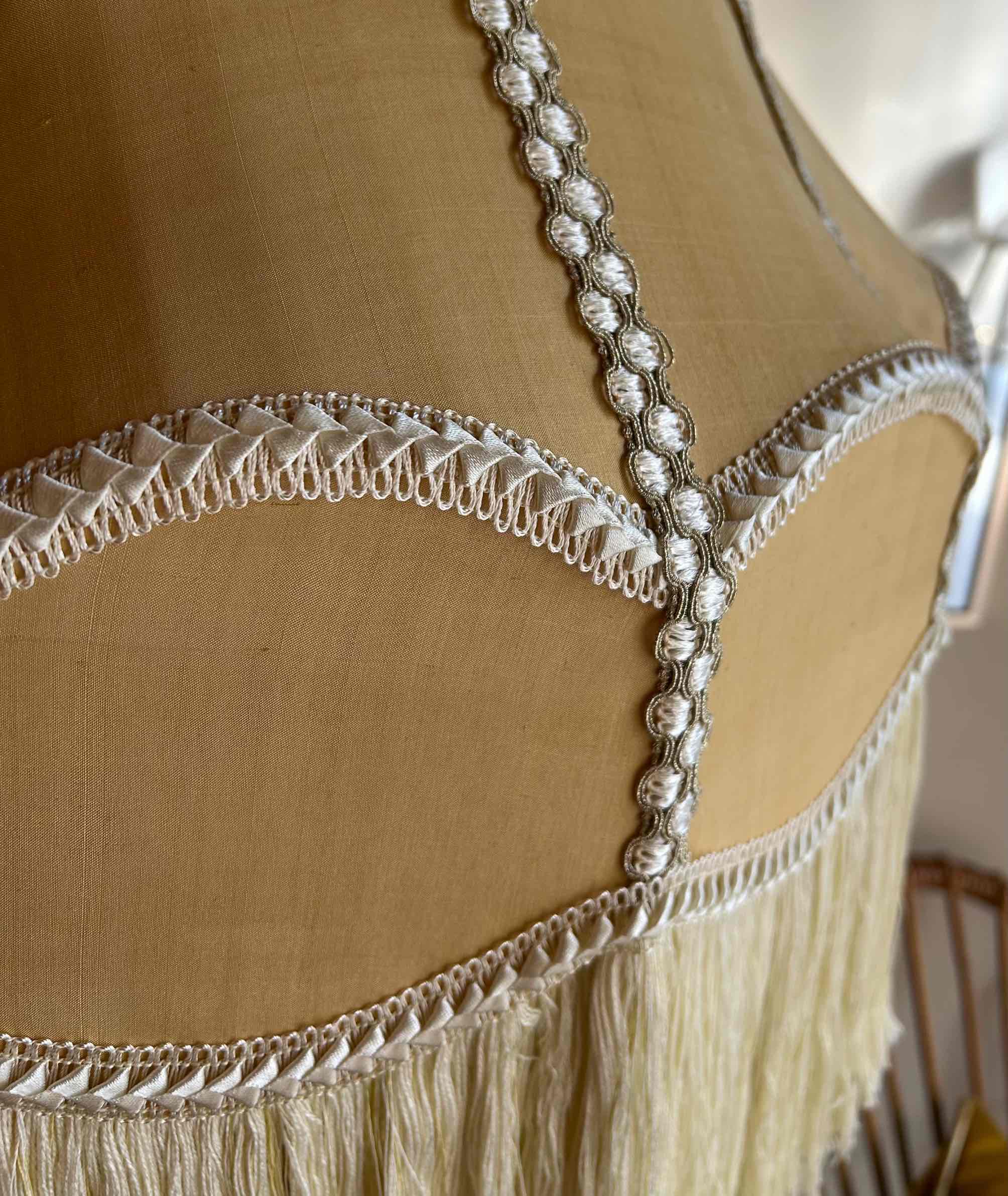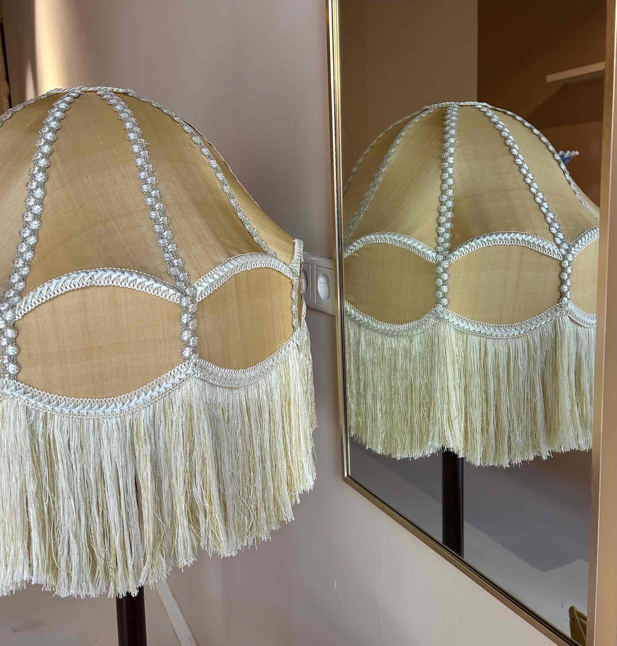 Deze prachtige lamp, die zowel als vloerlamp en als hanglamp kan dienen, is hand-genaaid en bestaat uit twee lagen zijde, afgewerkt met opvallende passementen.
