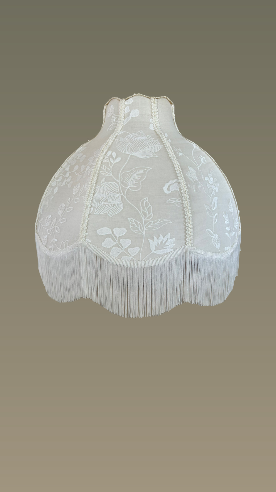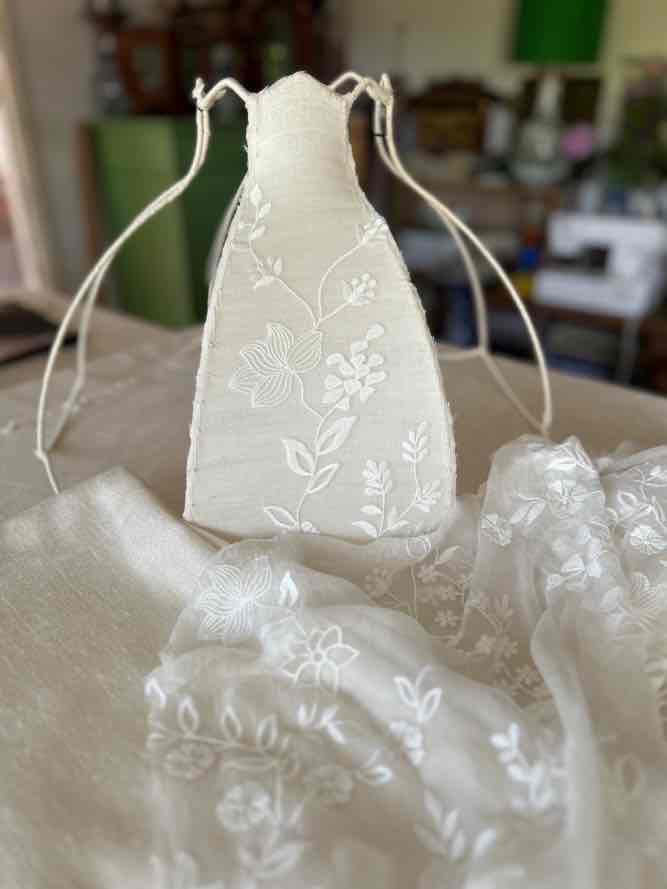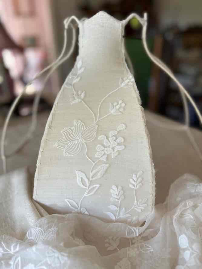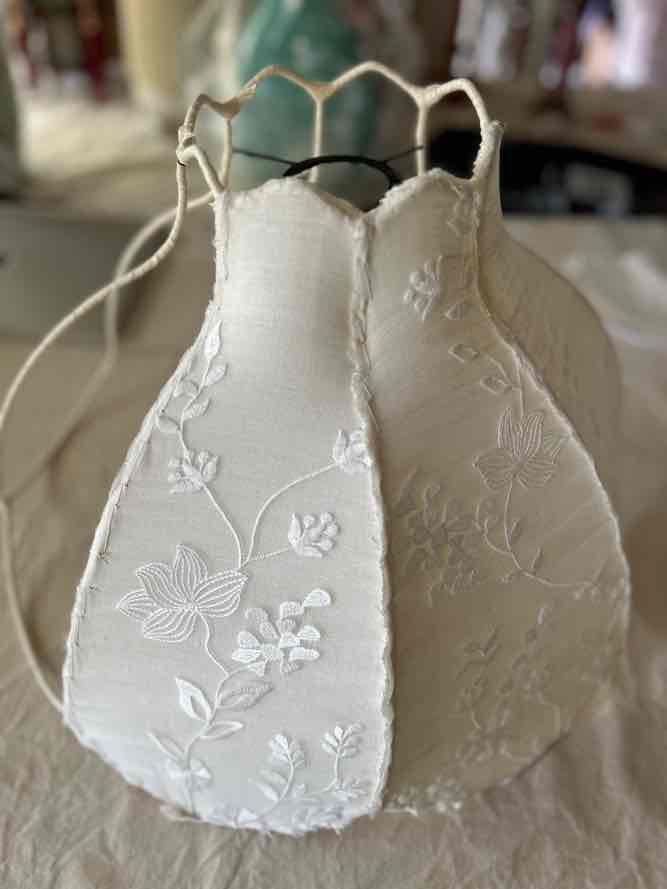 Deze prachtige hand-genaaide ‘one-of-one’ hanglamp is een absolute sfeerbepaler  in elk interieur! Zoals de foto’s laten zien is de lamp paneel voor paneel tot stand gekomen. Ik heb gebruik gemaakt van twee lagen zijde. De onderste zijde is wat dikker en vormt de basis en daarover heen is een ragfijne geborduurde zijde genaaid. Beide zijde stoffen zijn van prachtige kwaliteit.